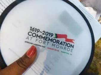 (photo, left, Commemorative Fan for the Fort Monroe African Landing Day in 2019)